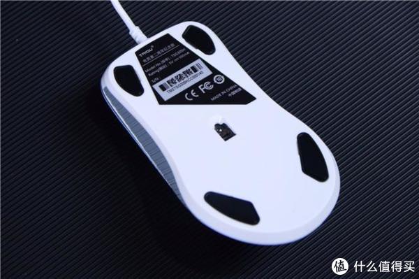 早来看一下鼠标的底部,为全白色的ABS材质,除了贴有相关的参数标签外,在鼠标的四角还设计了较大面积的磁吸式脚贴,表面非常的光滑,可有效减少摩擦力,体验过程中很流畅。