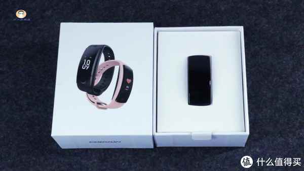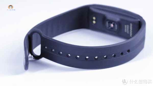 打开包装可以看到手环主体,背面有品牌的LOGO、心率传感器和充电接口。