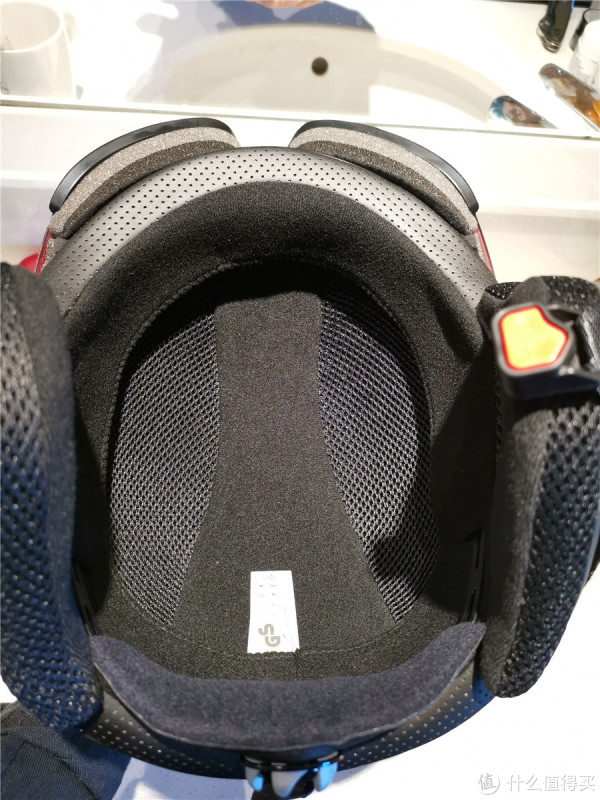 头盔内部设计简洁且透气,产品标签(德国制造)前端可见的仿皮质包边,实际上Alpina的滑雪头盔80%以上都是德国生产