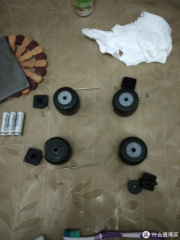 车轮,传动齿轮,前后轴一览,下面的牙刷是主要清洁工具...