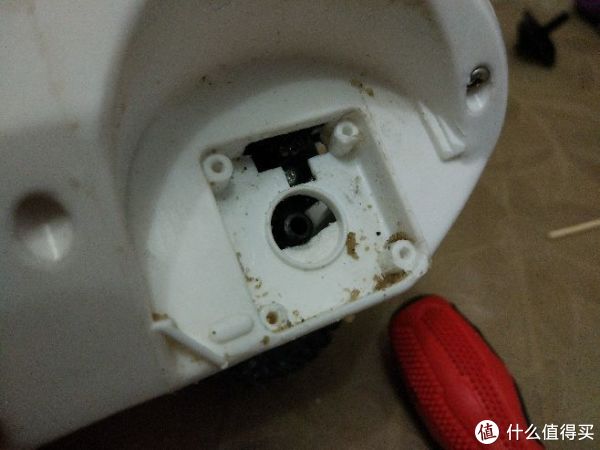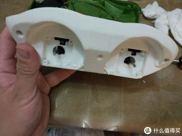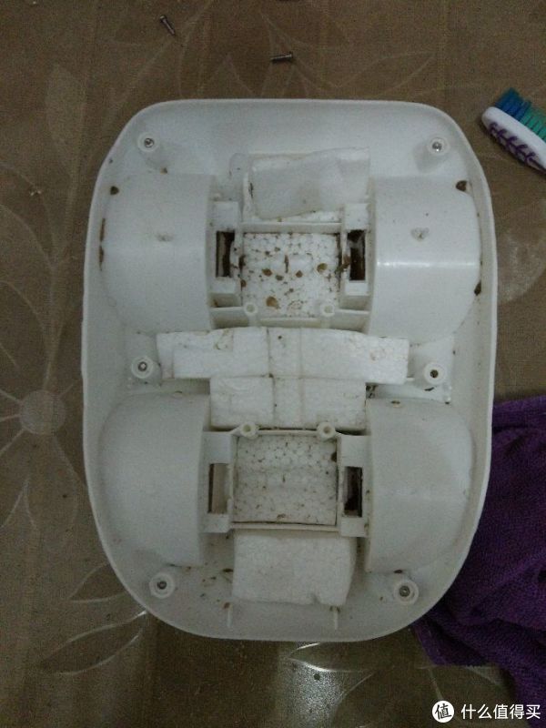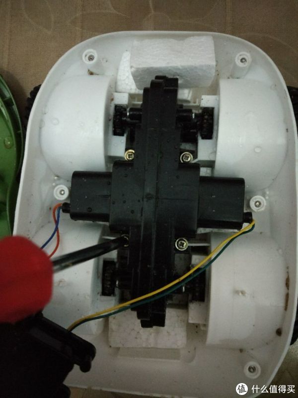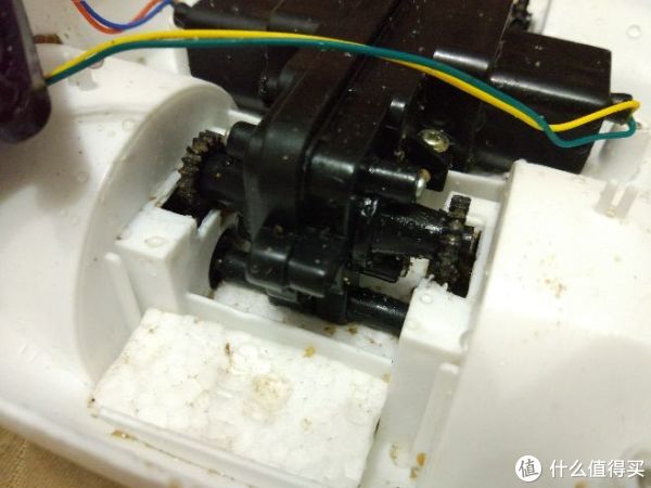 清洗前的底盘,可以看到六个固定螺丝的位置。大块的泡沫塑料负责提供部分浮力,另外的浮力由四个车轮子提供。