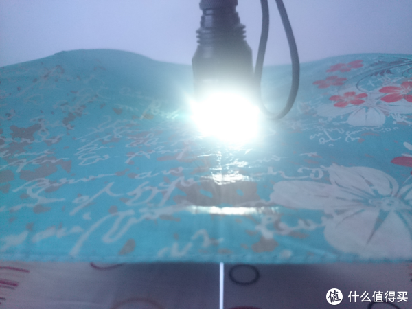首先是以前在家乐福15块买的雨伞,纯雨伞,无黑胶。可以看出从上往下照射时,伞下已经亮成一片,从下往上看时有很亮的一个光斑,略有刺眼。