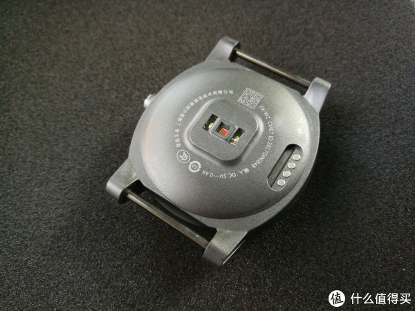W2背面则是塑料材质的,中间是心率监测传感器、右侧4个金属触点是充电触点。总体来看,W2手表表盘的设计感较弱,并无什么亮点。