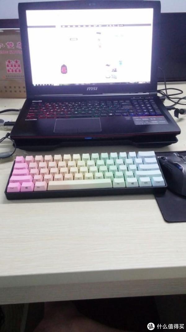 晚上照的图,各位看官将就的看看吧。发现点啥?带彩虹灯的薄膜赛睿键盘和不带灯的彩虹机械键盘,各有各的味道吧,但是但从手感上说,我已经回不去薄膜的时代了,虽然微星把他的赛睿键盘说的很高大上,但是我只把它当灯用。