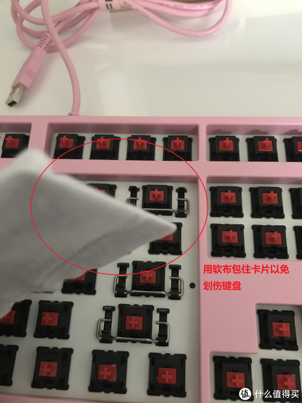 拆卸键帽时亦然,先拆除周围键帽,再将键帽拔起使钢丝竖起,再慢慢推出两侧卡扣