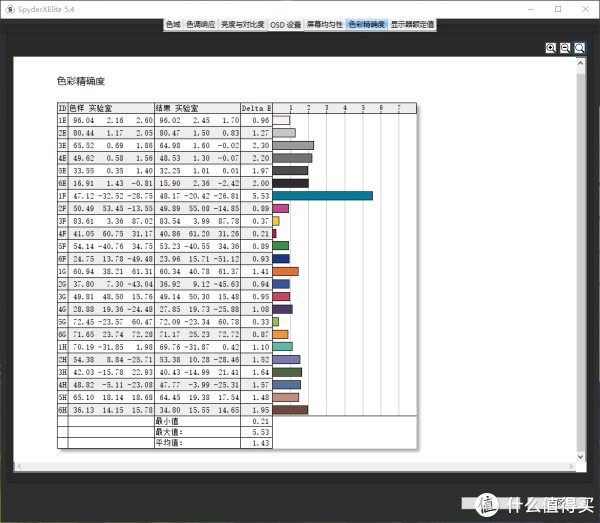 最后是最为重要的色彩精确度测试,也就是大家经常看到的ΔE。色彩精准度ΔE值反映的是显示器与标准值之间差距的大小,因此其数值越小越好,分数越高说明色彩越失真。测试结果如下图所示,对于测试中的24种颜色来说,明基PD2700Q的ΔE平均为1.43,大大优于官方宣传的ΔE<3,可以说是很优秀了。