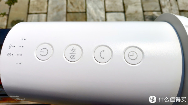 主机顶部为四个按键,从左至右分别是:开关键、风量调节/模式切换键、摇头键、定时关机键。六个指示灯为:自然风指示灯、Wi-Fi指示灯、风量/定时指示灯组(就是四个一串的那几个灯)。其中,Wi-Fi指示灯的显示状态为: