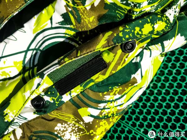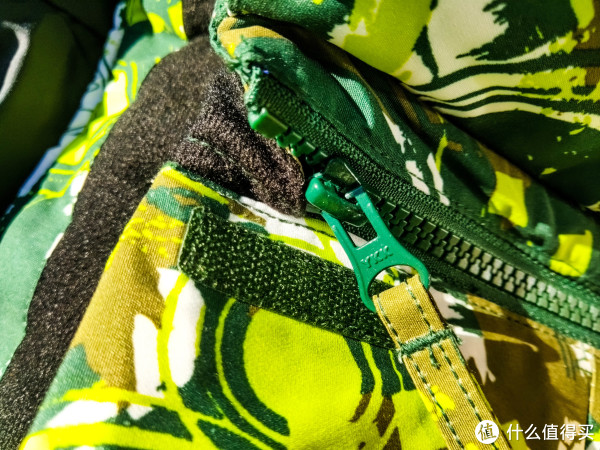 再来看一下拉链,拉链外侧门襟处设有五处强力魔术贴进行固定,将拉链隐藏在门襟内,可以保证在户外运动过程中有效的加固门襟的贴合度,可以起到更好的防风、防水功能。