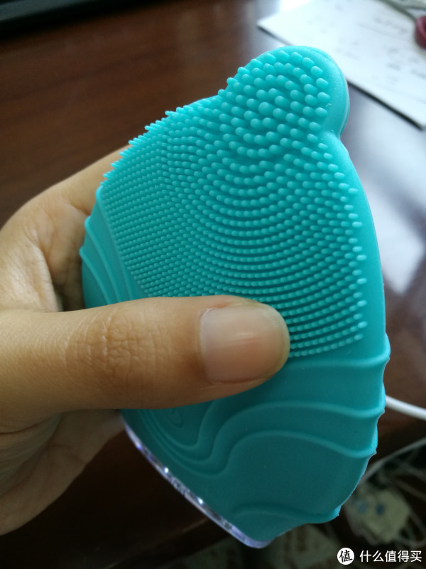 ,其实还挺符合人体工学的,鼻子等小角落照顾的到。刺刺是软的,然后有些渐变,顶上的大而疏,下面的小而密。上面的为了鼻子等粗糙处,下面的大面积估计是给全脸柔软处的。机子上的+ -号是调接震动感的,太懒,基本不用,