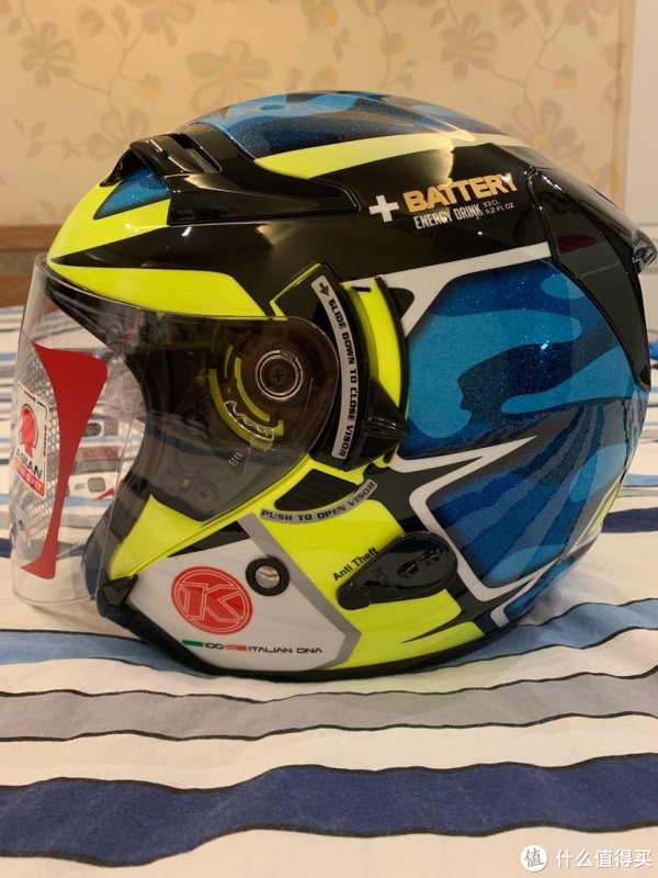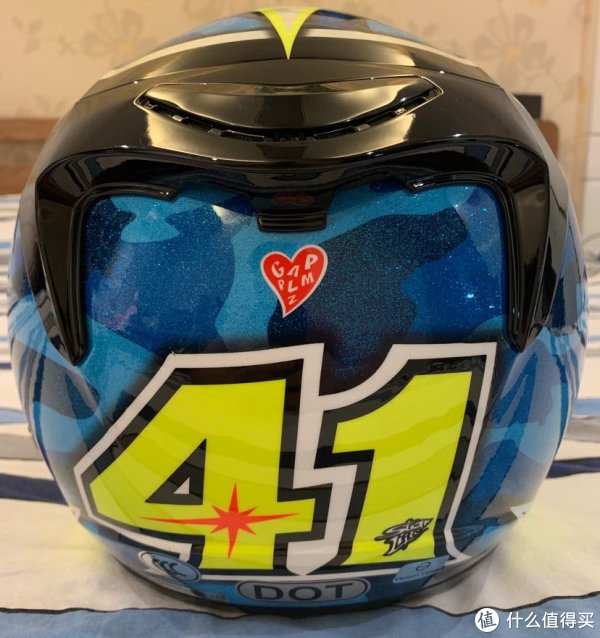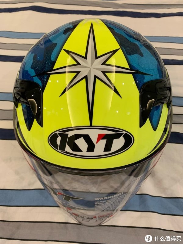 顶部向下看,大大的KYT标志,还有一个巨大的六角星,黄色和蓝色鲜艳的配色有助于在骑车的时候比较显眼,便于后车观察,有利于安全,这也是我选择这个花色的原因。