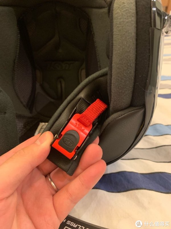 头盔内部以透气材料为主,看着十分厚实,比较柔软,隔着内衬摸到中间材料,手感类似泡沫箱的材质,关键时刻就靠这些东西保命。