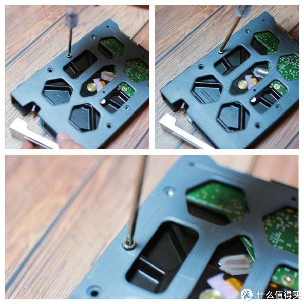 硬盘的电路板印刷面朝上,接口朝扳手反方向,固定好4个螺丝便可。