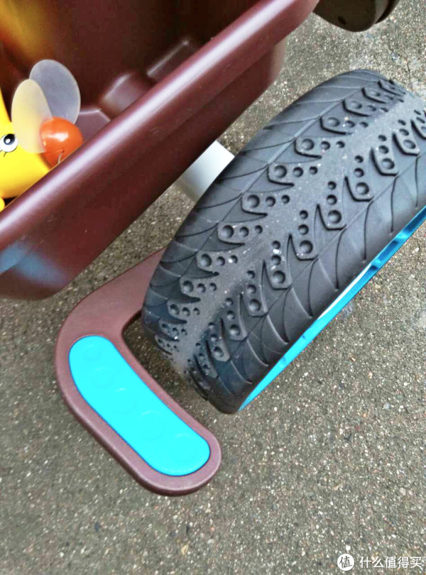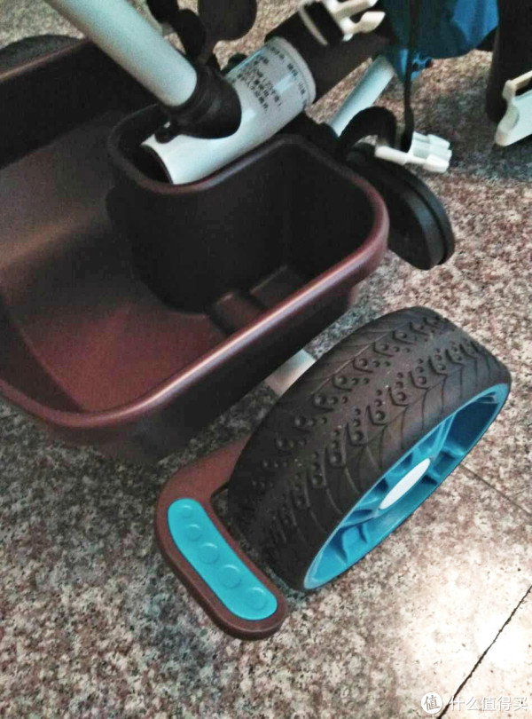 这张图能看到轮胎的纹理,防滑,会不会儿子长大了骑不动啊,大家都再说难推来着。脚刹比较好,更安全,而且使用起来很方便,顺脚的很。