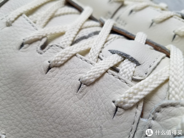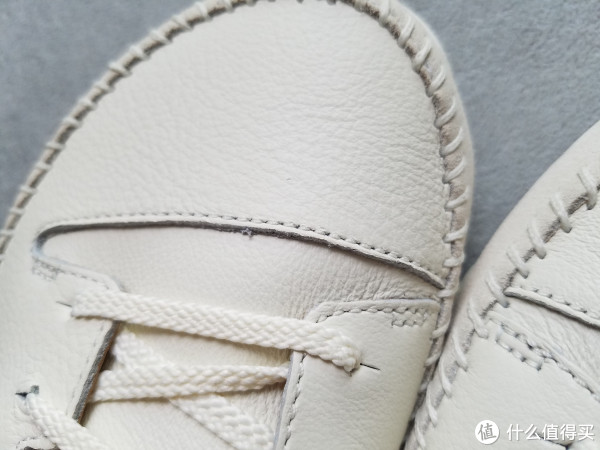 鞋舌边缘也采用了缝线加固,在其中一只鞋舌上有残留的胶和污渍,这是一个做工问题,应该可以清理不过后面再说。鞋带的穿孔采用了T字型开口,看着比较顺滑服帖。鞋带上挂着的Originals的吊牌同样为真皮材质,手感细腻柔软。
