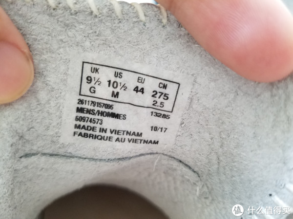 鞋标,这个码数比起运动鞋就有点乱了,UK9.5、US10.5、44码,我脚长280mm穿进去是刚好合适,起初我以为这双鞋还会偏大,其实一点富裕的空间都没有了非要说的话我认为还有点偏小。鞋标的真假不会判断,显示的越南制造,生产日期是17年10月。