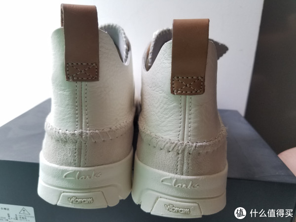 Moccasin工艺细节,可以看出头层皮和翻毛皮都非常完美。鞋后跟有两条较高的棕色提带,鞋底有Clarks和vibram的标识,注意看左鞋的垂直缝线有明显的倾斜,也算是一处小瑕疵。