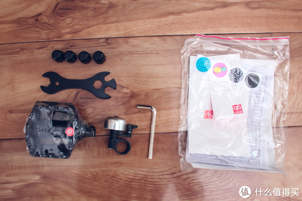 这就是包装内的东西,四个塑料扣、安装工具、铃铛还有脚蹬