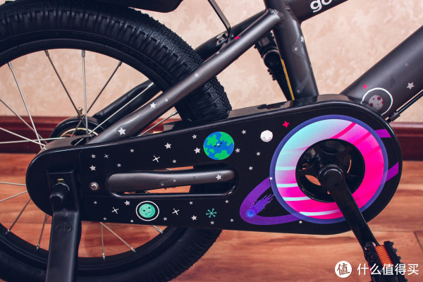大部分通车的特点是链条全包设计,塑料饿材质上有太空的图案,粉色与紫色相间的应该是土星吧,很好看