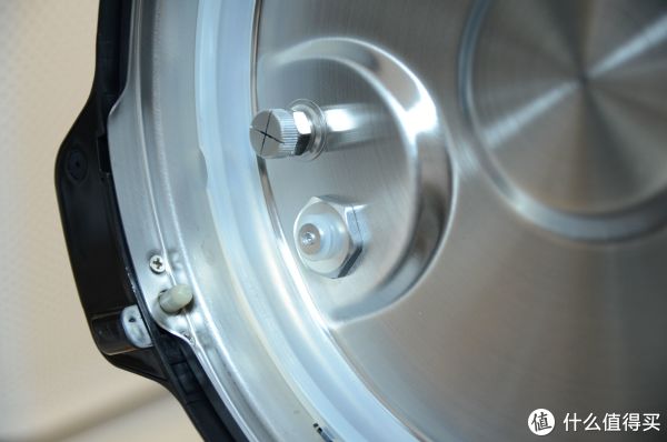 锅盖内部使用也是不锈钢材质,上方那个十字开口的螺丝是防堵出气孔,给限压放气阀使用,下方是安全眼的内部活塞,可以看到还有一圈胶圈。