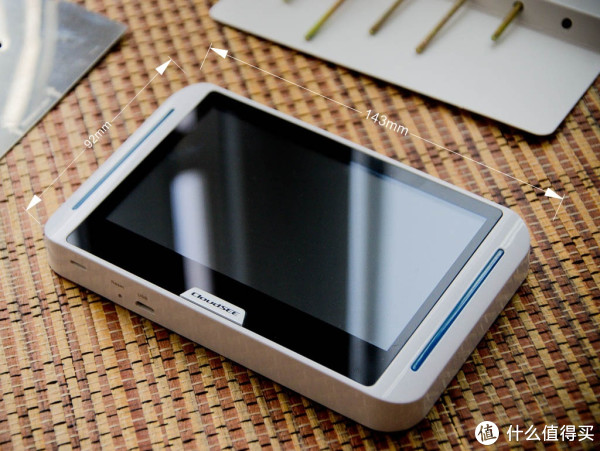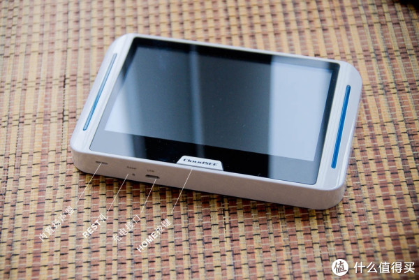主机搭载了一块5英寸的屏幕,屏幕分辨率为 800*480,支持单点触摸,清晰度还不错。主机的下方是实体的HOME键,底面是扬声器、REST孔、充电接口,说明书上有个和手机取卡针一样的东西,就是用来捅复位键的。