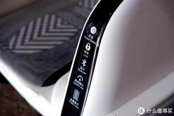 电源开关位于平衡车前部,轻按即可开机。开关下方的显示面板可以看到锁车指示、蓝牙指示、限速模式和电量等信息。