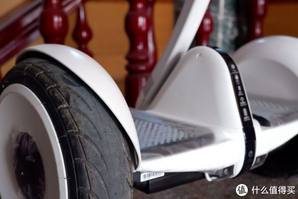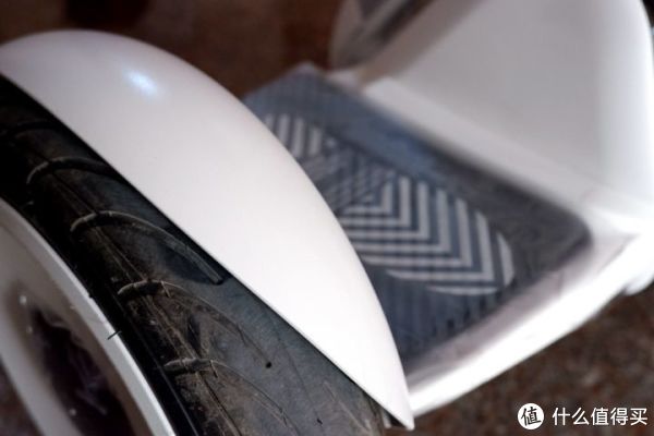 九号平衡车整体科技感很强,细节的做工也比较到位:脚控杆的提手部分为软垫,触感舒适;轮胎上方加入了挡泥板;脚踏上有贴纸标明了正确的上车方向,这个要特别注意,上车方向错误有可能会导致事故的发生。