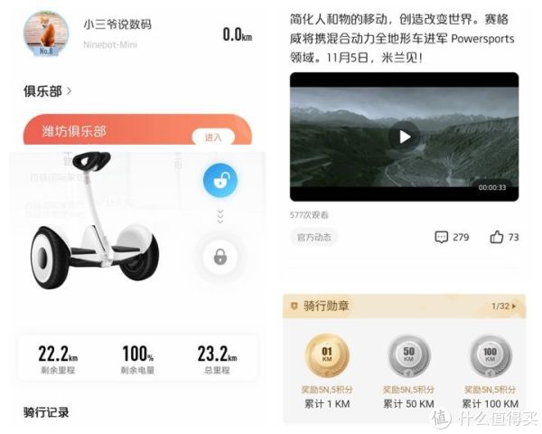 除了正常的骑行,我们还可以通过Segway-Ninebot来实现更丰富的玩法操作。通过蓝牙将手机和九号平衡车配对之后,在APP中可以查看剩余里程、剩余电量和行驶总里程等信息,还可以进行骑行轨迹记录和一些常用功能的设置。此外,APP中还提供了骑友的动态分享圈子和实时榜单、俱乐部以及商城兑换等功能,平时看看大家分享的骑行心得,学习更多的骑行技巧,或是跟俱乐部的朋友相约骑行都是非常不错的。