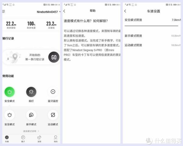 在常用功能中,我们可以对九号平衡车进行模式切换、灯效设置、蓝牙遥控等多种设置。九号平衡车为我们提供了新手模式、安全模式和速度模式三种骑行模式,其中安全模式下最高速度为7KM/H,非常适合孩子骑行。