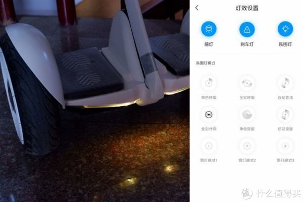 我们还可以通过APP对前灯、刹车灯和氛围灯分别进行设置,其中氛围灯预设了9中模式,并且支持自定义灯光色盘,让我们可以随手打造出时尚炫丽的灯光效果。
