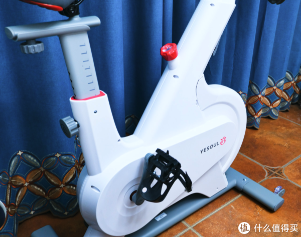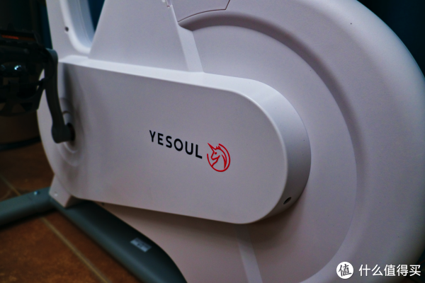 单车的主体使用了大面积的白色塑料包裹,点缀着 YESOUL 的 Logo,十分简洁大方。正因为大面积的塑料包围,所以我才能放心的在家中锻炼,不会担心误伤到孩子。内部采用了磁吸的阻力设计,这是其静音的保证,而且磁吸的设计更容易保持设备的稳定性,减少了单车的维护工作。