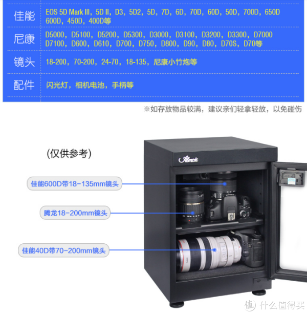 卖家给出的这款防潮箱所能放置的器材大致清单,居然没有将我大法的产品。当然一般单反能够放的,尺寸更小的微单肯定不在话下了。