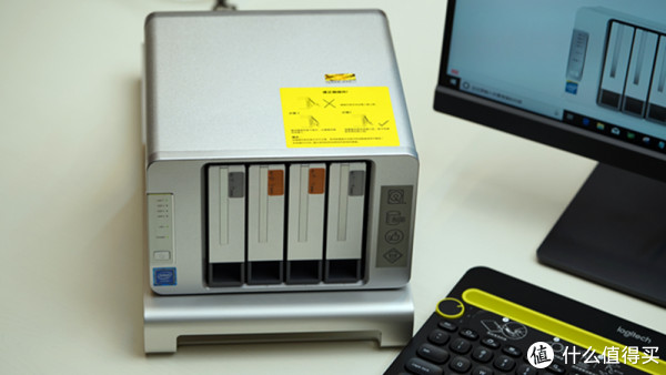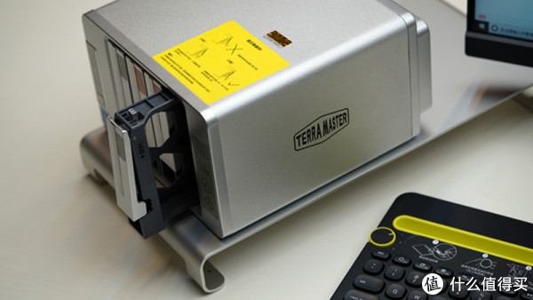 铁威马F4-220 NAS网络存储器,卡扣+竖向抽拉式硬盘托架。醒目的黄色标签,提示硬盘托架的正确操作——先掀开再拉出,先推回再卡紧,咔哒一声卡扣锁紧。