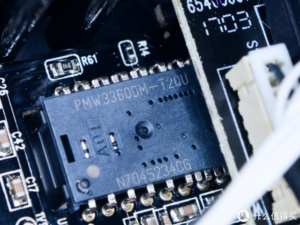 鼠标的处理引擎是原相科技的PMW3360DM-T2QU,最高支持12000分辨率: