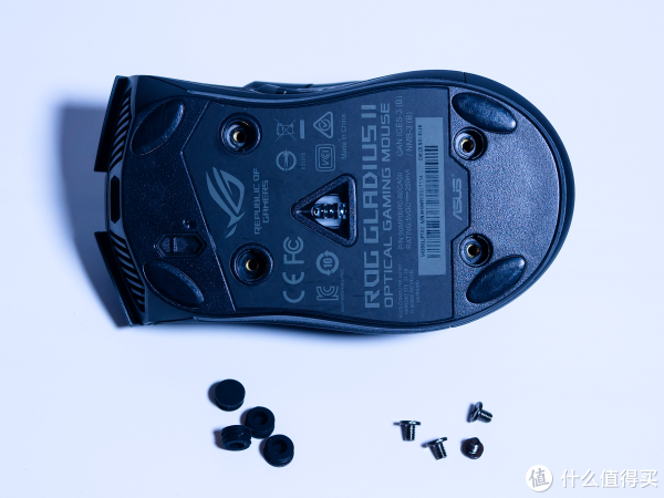 之前我说过买这款鼠标的原因之一是用户可以自己换微动。先将背面的螺丝孔上的4颗胶塞拔出来,再用起子将4颗螺丝拧下来:
