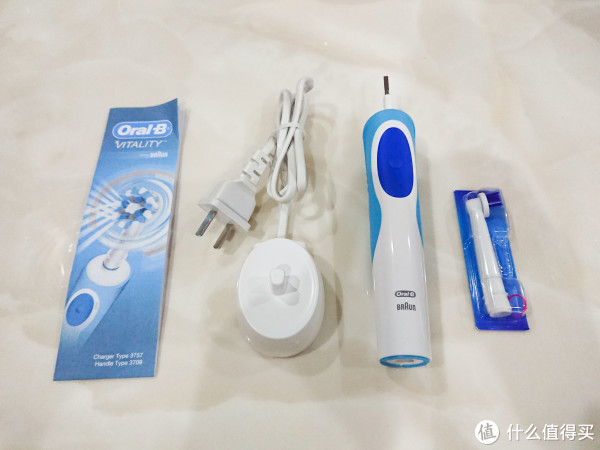 打开盒子,内部配件包含:说明书、充电器、牙刷本体、刷头。