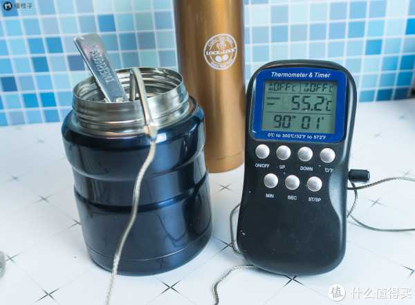 看下具体的温度吧,8个小时过去,膳魔师的温度还有55℃左右,这个温度入口可以,不烫。