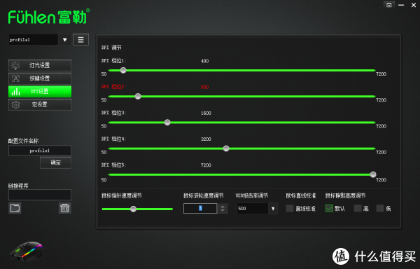 DPI设置界面,在这里可以设置每个档位的速度,还可以对鼠标的滚轮速度、回报率、直线修正、静默高度进行调整。