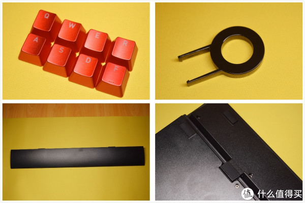 三是配件的部分,提供了8个红色的备用键帽、拔键器以及手托,没有USB转PS接头。对于这个人体工学设计手托,为ABS塑料材质,可以为手腕带来更好的舒适度体验,同时为可拆卸式设计,而且是磁吸式设计,安装拆卸方便。