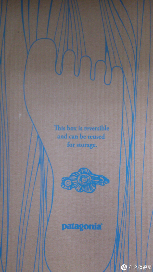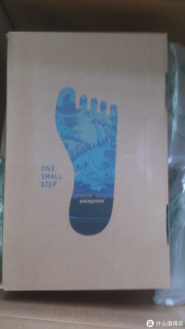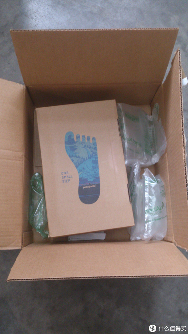 打开箱子之后就是一个小鞋盒子在里面逛荡了,还有几个气泡垫。Patagonia的鞋盒子也是挺逗的。正面写着One Small Step。每次都让我想起登月的那个月球一小步,人类一大步。盒子底面写着Made In China,不知道为什么写在盒子地下。一般都是侧面呀。鞋盒子侧面倒是有一个Member 1% for the Planet。好像和环保有关。另一个侧面贴着尺码表。