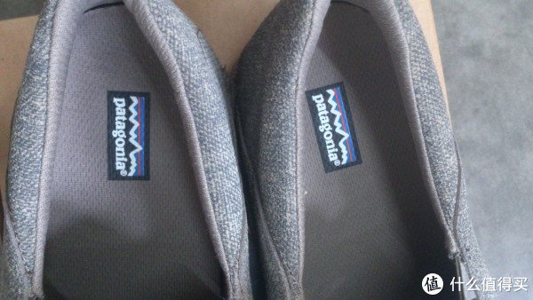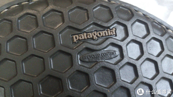 鞋后跟处patagonia的标志。两双鞋放在一起,两双鞋里的标志是一顺的。鞋底的图纹设计师前内凹后外凸的,应该是有助于行走。鞋底处也有patagonia的标志,下面还有recycle content,Matiere Recycle的图表。看来这个品牌真的很关注环保。