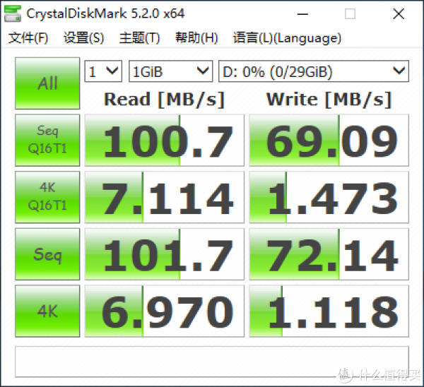 数码博主通病,直接来跑个分吧,先插在USB3.0接口上,读速100MB/s,写速69MB/s,这个成绩不错,达到标称值,符合USB3.0的读写速度,反而写入速度这么高我还有点惊讶。
