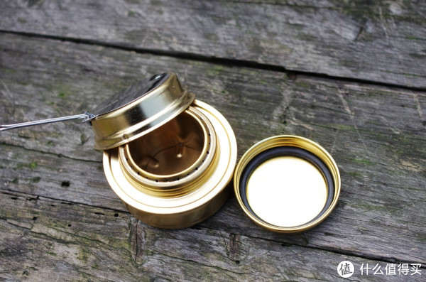 酒精罐,盖子带密封圈,出游的时候可以把液体或者固体的酒精放在里面携带,因为酒精炉是不能吹熄的,所以还附带灭火盖。