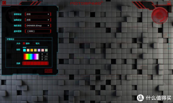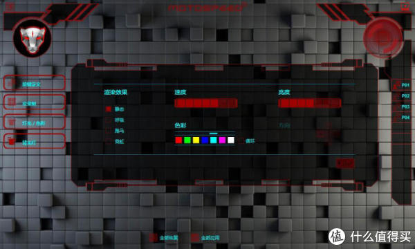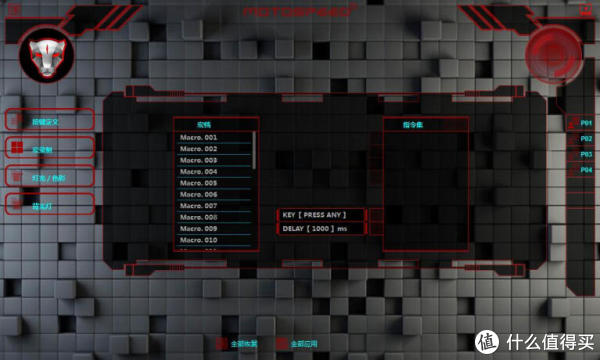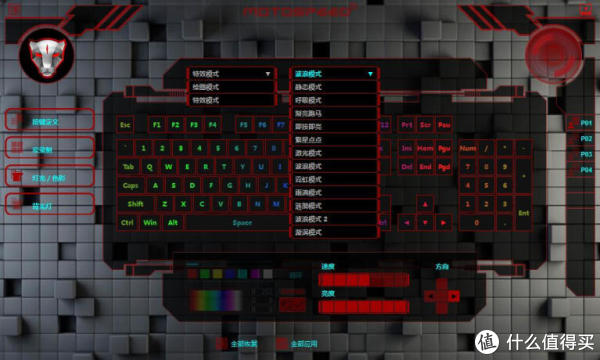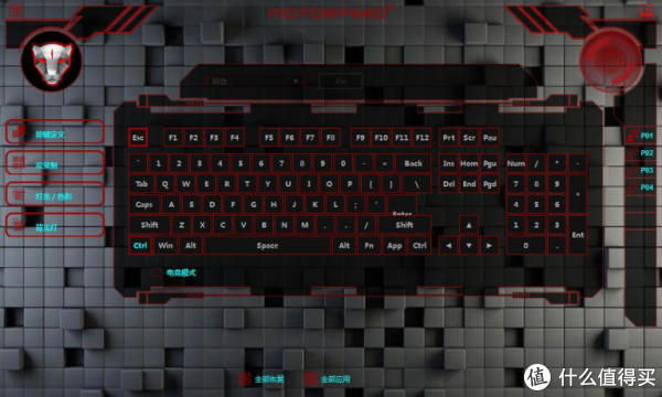 驱动主界面背景立体感不错,但是键盘却没任何美化。。共有按键定义、红录制、灯光、背光灯四个项目可调。