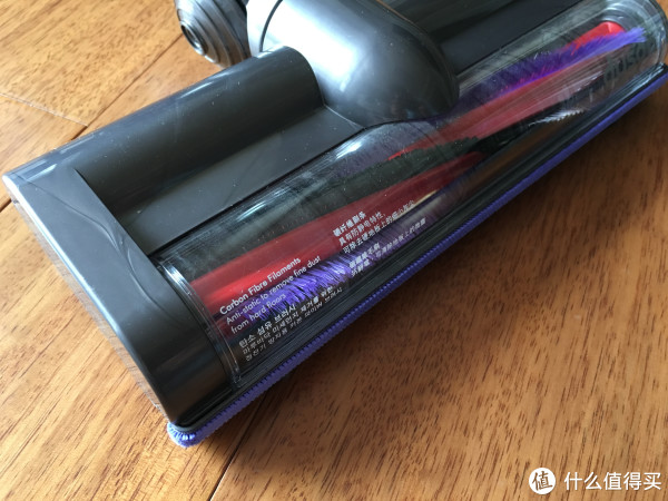 这是最主要的一个吸头,电动碳纤维毛刷吸头。前面的蓝色条状物是丝绒防撞杆,保护家具和墙面以防碰撞。里面蓝色的是碳纤维毛刷,用来吸除硬地板上的微尘;黑色的是尼龙毛刷,用来吸除地毯深层的尘垢。