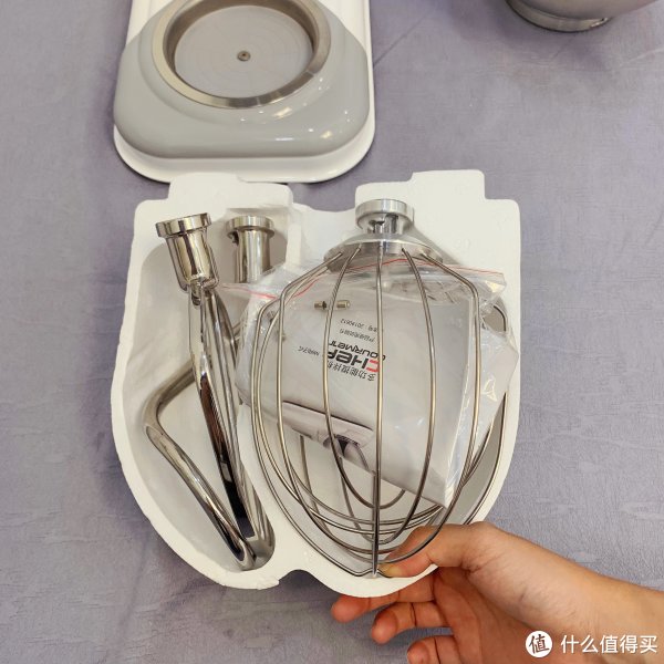 厨师机的配件也被一个半球型似的泡沫严实包裹,保护得如此细心周到,实属难得~打开泡沫,可见3个配件和说明书。