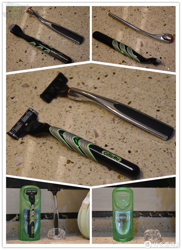 笔者家里正好有一把正在使用的吉列手动剃须刀来一起对比看一下,首先两者使用的手柄材质不一样,焕醒采用的是大面积金属的,而吉列采用的是塑料加防滑硅胶的;其次,焕醒是流线型扁平形状的手柄,而吉列是传统的圆柱形手柄;再者,焕醒的手柄就是一个单纯的手柄,刀头方向控制集成在到刀头内,而吉列手柄头部有一个刀头方向控制弹簧;最后,焕醒使用的是磁吸式刀头更换方式,而吉列则是传统的按压式更换方式;还有最后的一点就是,焕醒的沥水底座确实比较简约实用,剃须刀易拿易放