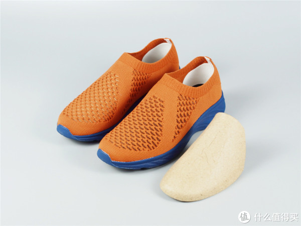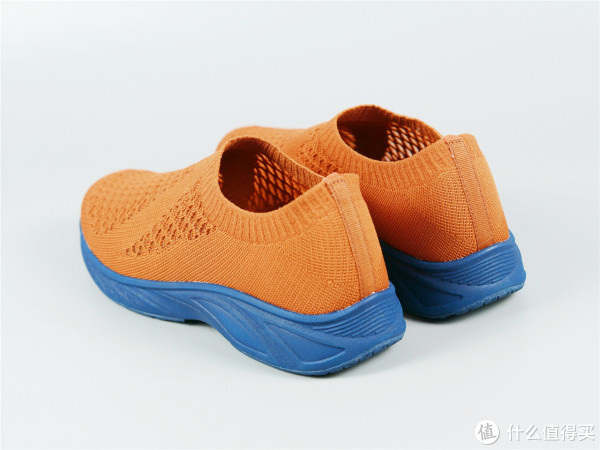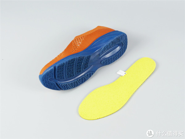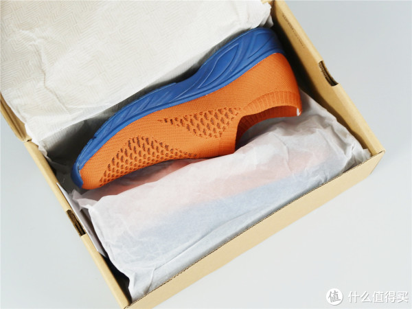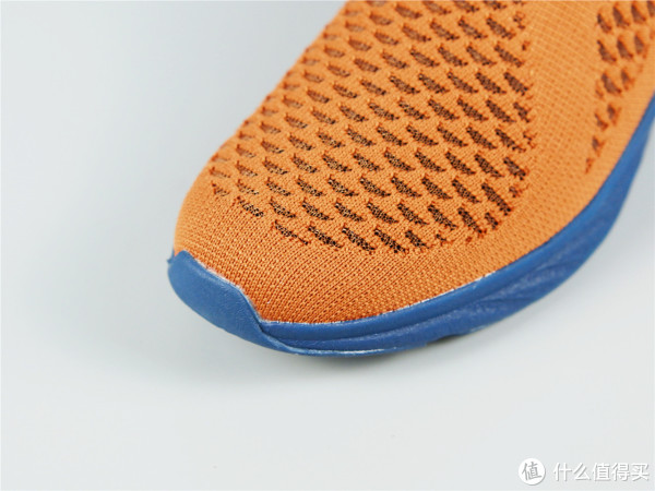 因为自己比较喜欢橙色的鞋面,蓝色的鞋帮鞋底更耐脏,所以自己购置这款产品。拿到这款产品的时候就是感觉比常见的鞋要轻很多,整体采用一体式针织设计,在鞋面和侧边有鱼鳞状的网面设计,从视觉效果上就很透气。