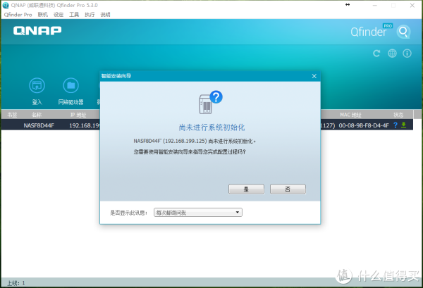 先从官网下载Qfinder搜索到NAS。然后提示进行初始化。
