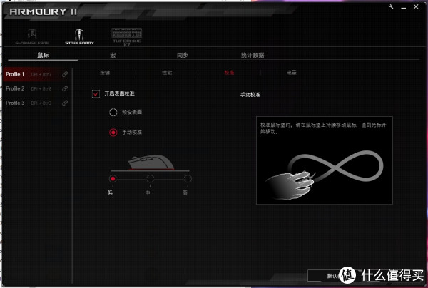 也支持对不同的鼠标表面进行校准,软件已经内置了很多ROG的鼠标参数,如果在用的鼠标垫不在列表中,也可以进行手动校准。