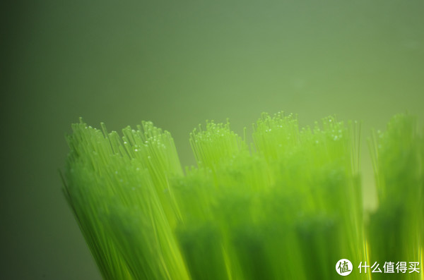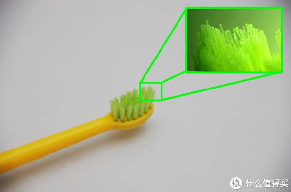 刷毛材质是比普通牙刷刷毛细的多的0.12mm直径的杜邦细软刷毛,尖端磨圆到0.01mm。圆刷毛虽然没有多边形刷毛那么强的清洁力,但保护性却强上很多,对于儿童牙刷来说,正是合适的选择。通过微距照片可以看到,刷毛尖端比较圆润,不会伤及牙齿表面和牙龈。